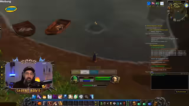05:14:19Gemeinsam mit einem Mitspieler erledigt der Streamer eine Killquest, bei der sie 30 Skelette vernichten müssen. Sie diskutieren über die Effektivität von Solo- versus Gruppengrinden, wobei der Streamer den sozialen Aspekt des Gruppenraids schätzt, auch wenn es langsamer ist. Danach bereiten sie sich auf den nächsten Schritt vor: das Treffen der gesamten Gruppe in South Shore, um gemeinsam per Flugzeug und Schiff zur Einstiegspunkt des Instanzenruns zu gelangen.