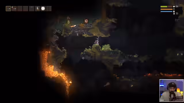 00:56:23Nachdem der Streamer im ersten Run an einem selbstgebauten, unbrauchbaren Zauberstab scheitert und stirbt, startet er einen neuen Versuch. In diesem zweiten Run ist er schon deutlich routinierter, sammelt Gold und findet besser funktionierende Zauberstäbe. Er begreift langsam die Mechanik des Spiels und erkundet die Welt gezielter, um Stärken zu sammeln.