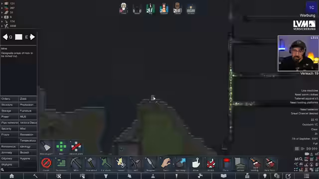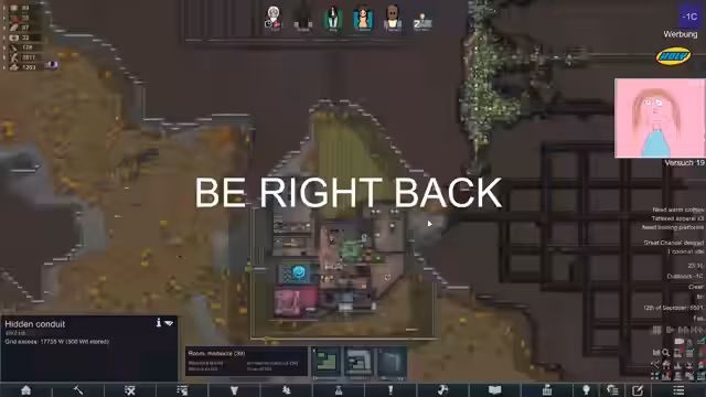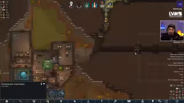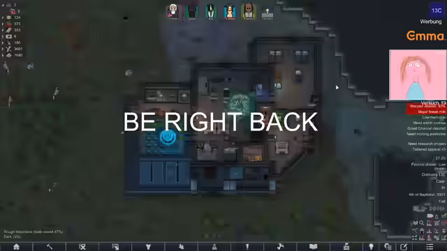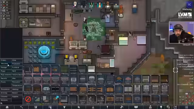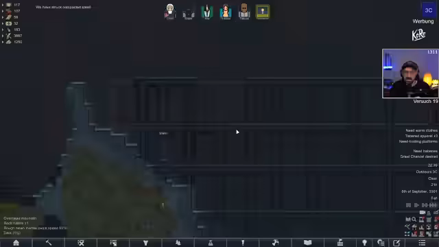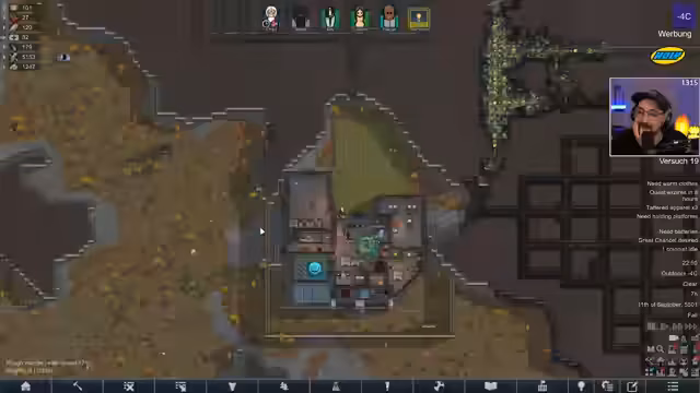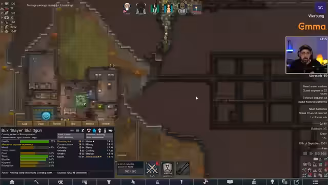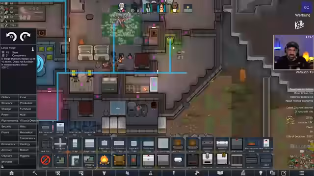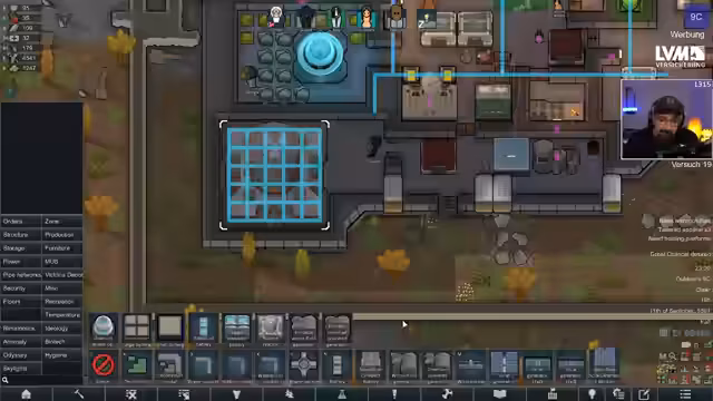 05:21:29Nachdem die Stromversorgung durch das Atomkraftwerk gesichert ist, konzentriert sich der Streamer auf die Verbesserung der Lebensmittelversorgung und der Infrastruktur des Raumschiffs. Er plant den Bau von Kühlschränken, insbesondere von Wallfridges, um Lebensmittel haltbar zu machen und die Effizienz des Kochens zu steigern. Automatische Türen (Auto-Doors) werden installiert, um die Laufwege der Kolonisten zu verkürzen und die Bewegung innerhalb des Raumschiffs zu beschleunigen. Die Verringerung der Hemogen-Vorräte für den Vampir-Kolonisten Chat wird als Problem erkannt, und es wird überlegt, Blut von den Kolonisten, insbesondere vom nutzlosen Säugling Serrano, zu entnehmen. Die Kolonie muss sich auf die baldige Flucht vor den näherkommenden Insekten vorbereiten, während weiterhin an der Optimierung der Raumschiff-Einrichtung gearbeitet wird.