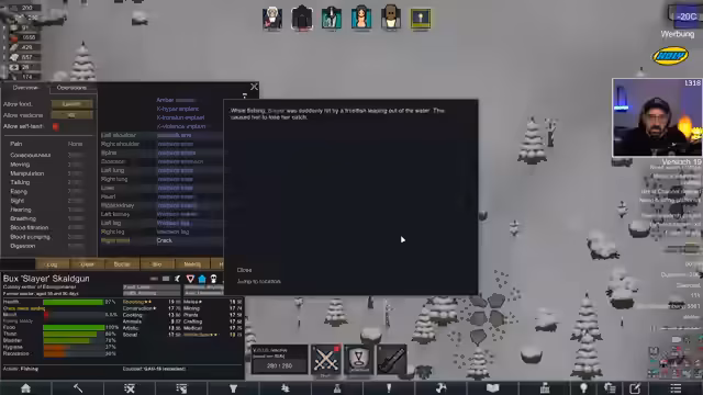 04:31:51Der Streamer steht vor der Herausforderung, wichtige Ressourcen wie Medizin zu beschaffen und die Abhängigkeit seines Charakters Slayer von Tee zu managen, da dieser sonst stirbt. Er plant, Hydroponik zu nutzen, um Drogen im Raumschiff anzubauen. Es wird diskutiert, dass Slayer eine genetische Psychid-Abhängigkeit hat, die nicht mit einem Addiction Remover behandelt werden kann, im Gegensatz zu klassischen Drogenabhängigkeiten. Auch Luciferium, das als Mikroroboter im Blut zur Reparatur dient, ist keine klassische Sucht und kann nicht entfernt werden. Der Streamer entscheidet sich, Advanced Components selbst herzustellen und Medizin sowie Gojuice zu kaufen, um die Überlebensfähigkeit seiner Kolonisten zu sichern. Zudem wird über den Verkauf eines Addiction Removers nachgedacht, da dieser für Slayers Zustand nutzlos ist.