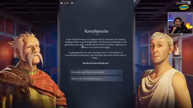 00:40:50Der Streamer widmet sich der Quest 'Valerias Einladung' und erinnert sich an frühere Erfahrungen mit Schlägereien bei diesem Event. Er bestätigt, dass die Garum-Route nach einer früheren Zerstörung nun wieder intakt ist. Bei der Ankunft am Veranstaltungsort wird er von einer Pläbierin angesprochen, die ihm gezinkte Würfel verkauft, deren Gewicht ihm seltsam vorkommt. Im Inneren der Veranstaltung stößt er mit dem betrunkenen Senator Sextus zusammen, der ihn zum Kampf herausfordert. Nach kurzem Überlegen entscheidet sich der Streamer, den Senator anzugreifen, woraufhin dieser von den Wachen entfernt wird. Als Belohnung für die Beseitigung des Chaos darf der Streamer den Platz des Senators im Finale eines Würfelspiels einnehmen. Sein Gegner ist Syrakus, ein bekannter Charakter. Die Regeln sind einfach: Die höchste Würfelzahl gewinnt, bei einem Unentschieden wird erneut gewürfelt. Der Streamer muss nun entscheiden, welche Würfel er verwenden möchte: Holzwürfel, Knochenwürfel, Goldwürfel oder die zuvor gekauften gezinkten Würfel.