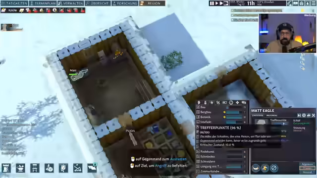03:38:34Ein plötzlicher Angriff durch eine Gruppe feindlicher 'Tibet'-Siedler ereignet sich. Der Spieler, 'Matt', und seine NPC-Siedler 'Wautz' und 'Mit Igel' werden angegriffen. Da keine Verteidigungsanlagen wie Falltüren fertiggestellt wurden, kommt es zu einer blutigen Schlacht. Der Spieler überleidet, doch seine Siedler abwehrkämpfen erfolgreich und der Angriff scheitert.