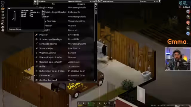 00:15:19Edo diskutiert mit dem Chat die Prioritäten für den Tag. Er plant, die Küche fertigzustellen, bevor er auf Nahrungssuche geht, um unnötiges Schleppen von Ressourcen zu vermeiden. Weitere Ziele umfassen das Plündern von Geschäften, das Beschaffen von Munition und das Organisieren von Wasser. Er äußert seine Sorge, während des Streams zu sterben, was zu vielen Fragen von Zuschauern führen würde, die nur abends schauen können. Der Streamer zeigt seine Sammlung von Gegenständen und plant, das Auto zu tanken, bevor er weiter lootet.