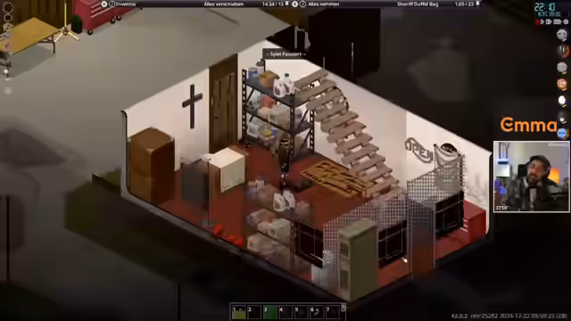 04:12:21Der Streamer bedankt sich für die Subs und erklärt, dass tagsüber gestreamt wird, morgen aber wieder wie gewohnt abends. Der Generator soll aufgetankt werden. Die Kapelle funktioniert nun. Es wird der Schlachtprozess von Kevin beschrieben: Tötung, Schlachtung, Essen, Aufhängen zum Ausbluten und Sammeln von acht Litern Blut. Der Streamer erwähnt ein großes Stellaris-Update und bedankt sich für Prime Subs. Es wird überlegt, wo ein Gemälde in der Küche aufgehängt werden könnte. Der Streamer plant, die Waffen zu sortieren und freut sich darauf. Holz ist ausreichend vorhanden, aber der Aufsatz auf dem Dach muss für den Winter noch gemacht werden. Es wird erklärt, dass das Spiel durch Strom- und Wasserausfälle schwerer wird, aber die Zombies nicht stärker werden. Der Streamer baut einen kleinen Waffenschrank und Vorhänge, um den Raum abzudunkeln. Die USA-Flagge wird ironisch betrachtet. Es wird überlegt, wo Lampen aufgehängt werden können. Der Streamer ist noch eine halbe Stunde da und muss dann duschen, weil Besuch kommt. Es wird überlegt, die Wände zu verbessern, aber es gibt wichtigere Dinge zu tun. Der Schlacht-Galgen für Kevin wird gezeigt. Der Streamer stellt fest, dass die Lampen nicht in den Raum gebaut werden können und die Korkwand nicht benötigt wird. Es wird ein kleiner Waffenraum eingerichtet. Der Streamer erklärt, dass Batterien nicht an den Generator angeschlossen werden können. Schachbrett und Tagebuch werden platziert. Der Streamer spielt seit zwei Monaten und 20 Tagen und muss schlafen, da es zu dunkel wird.