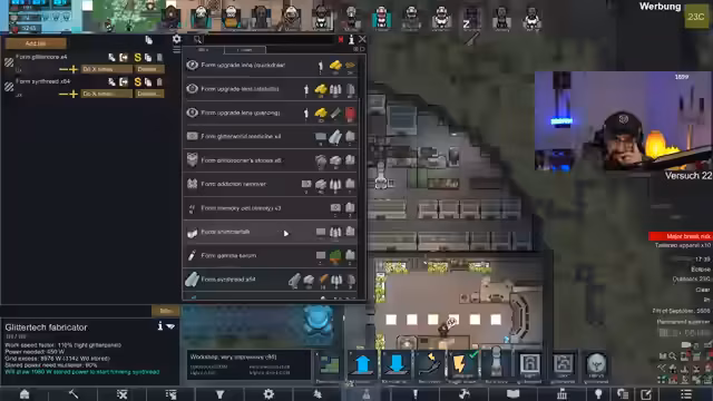 00:15:55Nach dem Login in Rimworld konzentriert sich der Streamer darauf, das Raumschiff fertigzustellen. Der aktuelle Zustand ist bereits beeindruckend, aber es fehlen noch entscheidende Elemente. Vor allem die Sauerstoff- und Heizungssysteme sowie die Vakuumresistenz müssen vervollständigt werden. Dafür werden mehr Graph Field Extender benötigt, die sich auf orbitalen Plattformen im Orbit befinden. Die unmittelbare nächste Aufgabe ist daher der Aufbau einer stabilen Infrastruktur, um sicher in den Orbit fliegen zu können.
