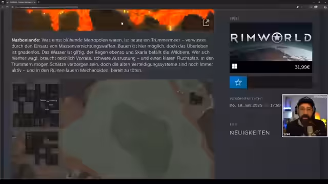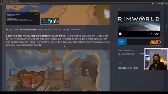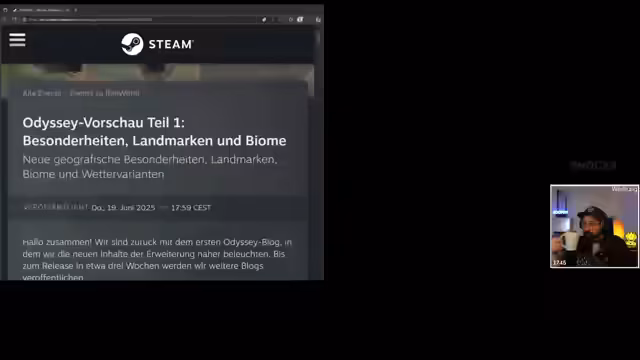 00:17:12Der Streamer beginnt mit der detaillierten Vorstellung des ersten Blogposts zum RimWorld-DLC 'Odyssey', der in etwa drei Wochen erscheinen wird. Das DLC wird neue geografische Besonderheiten, Landmarken, fünf Biome und dynamische Wettervarianten einführen. Besonders hervorgehoben wird die verbesserte Kartengenerierung, die erstmals die riesigen Spielwelten nutzbar macht. Die Streamer zeigt Begeisterung über die neuen Inhalte, insbesondere über die Erkundungsmöglichkeiten mit dem neuen Raumschiff-System.