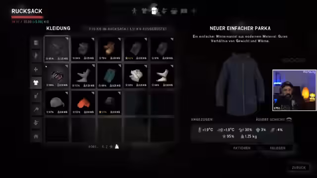 01:14:23Der Streamer priorisiert das Erlernen neuer Fähigkeiten wie Wildnisküche, die ihm ermöglicht, 10% mehr Kalorien aus der Nahrung zu gewinnen. Bogenschießen wird ebenfalls als wichtig angesehen, da der Bogen benötigt wird, um Tiere zu jagen. Gleichzeitig muss er seine Kleidung reparieren, insbesondere den Parka, der ihm besseren Schutz vor Kälte bietet. Die Entscheidungen über die Ressourcenverwendung sind strategisch und zielen darauf ab, die Überlebenschancen durch bessere Ausrüstung und verbesserte Fähigkeiten zu erhöhen.