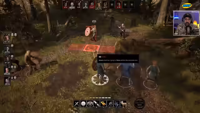 00:45:07Ein Gefecht mit Briganden dient als Demonstration des Kampfsystems. Der Streamer nutzt die taktischen Optionen, indem er seine Charaktere positioniert, sie gegnerische Ziele markiert und spezielle Fähigkeiten wie Knockback und das Tauschen von Plätzen einsetzt. Ziel ist es, die feindlichen Linien zu brechen, Schlüsselziele zu erreichen und Truppen zu flanken, was den strategischen Charakter des Kampfes unterstreicht.