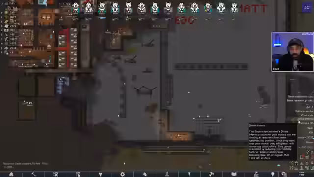 01:24:14Da sich die Kolonisten nicht bewegen können, weil sie überladen sind, und der Hubschrauber durch Raketen beschädigt wird, unternimmt der Streamer einen letzten verzweifelten Versuch. Er versucht, die überlebenden Kolonisten zu evakuieren, indem er eine Rettungskapsel nutzt. Dieser Versuch scheitert jedoch ebenfalls. Der Streamer gibt den Missionseingang endgültig auf und beschreibt dieses Run als das stressigste und frustrierendste Erlebnis in seiner RimWorld-Spielerkarriere, da die Performance-Probleme und der Spiel-Bug den kompletten Spielspaß zerstören.