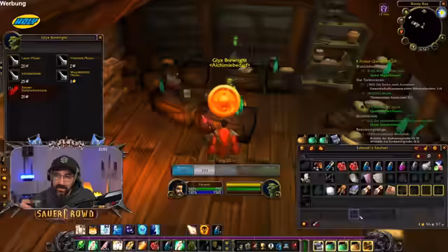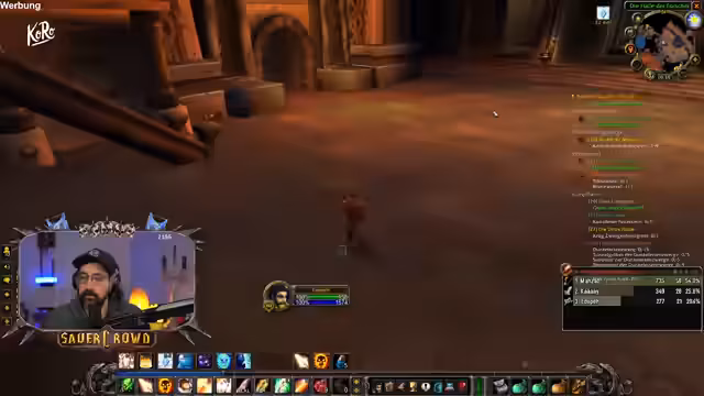 04:03:59Die Gruppe navigiert durch ein Gebäude, was zu Verwirrung führt. Der Streamer sucht einen NPC für eine Questabgabe. Gleichzeitig wird auf ein Community-Event bei Sauerkraut hingewiesen: ein 'Deal or No Deal'-Event um 18 Uhr in Stormwind. Der Streamer ist unsicher, ob er teilnehmen wird, da er große Gruppenstress vermeiden möchte.