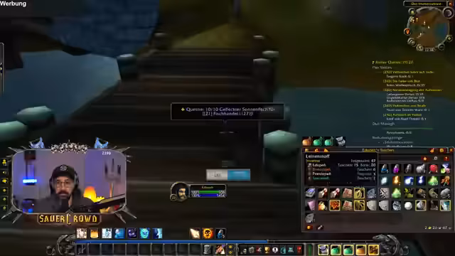 08:25:40Die Gruppe kehrt nach einem Ausflug in die Minen nach Sturmwacht zurück, um dort eine spezifische Quest zu beenden. Die Suche nach Quest-Items gestaltet sich etwas zeitaufwendig, da man nicht weiß, ob die Gegenstände nur durch das Abschließen der Quest oder auch als Drop von den Gegnern erhältlich sind. Der Streamer vergisst oft, wichtige Quest-Items nicht zu verkaufen, was zu Verwirrung führt.