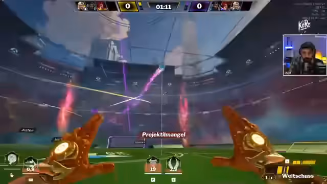 00:54:57Der Streamer startet Vector Strike und richtet die Kamera sowie die Lautstärke ein. Er wählt Project Mercury und startet das Spiel. Er erwähnt, dass er Vanilla Expanded Meccanoids noch nicht ausprobiert hat. Er startet ein Einzeltraining, um die verschiedenen Skills der Charaktere kennenzulernen. Das Spielprinzip ähnelt Rocket League, jedoch mit der Möglichkeit zu laufen und zu schießen. Er erklärt, dass man Munition in den Ecken einsammeln muss, ähnlich wie in Rocket League. Er testet, ob die Kameraeinstellung passt und öffnet Discord, um später ins Bon Jovi Discord zu wechseln. Er stellt fest, dass man den Ball auch festhalten kann. Der Urlaub war schön. Er versucht, den Ball einzusammeln und zu werfen. Er glaubt, dass das Spiel ein Darlow-Game sein könnte und man predikten muss, da der Schuss langsam fliegt. Er möchte gegen Dado spielen und Random Teams machen. Er erinnert sich an einen Black Screen Fehler nach dem Tutorial und ist gespannt, ob der Fehler noch vorhanden ist.