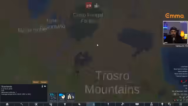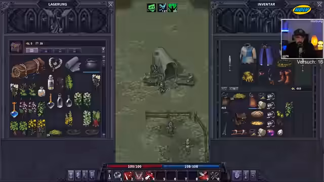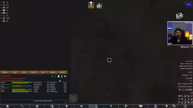 00:17:02Ein plötzlicher Tod setzt den Lauf abrupt und ärgerlich beendigt. Eine große Herausforderung ist die sehr niedrige Immunität des Charakters, was das Überleben erschwert. Um die Immunität zu steigern, muss der Streamer kochen, aber das passende Gemüse ist rar und verdirbt schnell. Er muss daher effizient sammeln, kochen und seine Ressourcen wie den Schlafsack strategisch einsetzen, um Überlebensvorteile zu sichern.