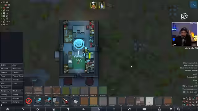 04:14:59Der Stream wechselt zu RimWorld V.O.I.D. mit einem geplanten, straffen Zeitplan. Ein besonderer Fokus liegt auf der Nutzung von Mods, die aufgrund des Void-Themas als legitim angesehen werden. Eine zentrale Rolle spielt der Anima-Baum im Raumschiff, der im Laufe des Spiels wachsen und meditative Fähigkeiten ermöglichen soll. Es ist ein langer, zukunftsweisender Run geplant, bei dem alle Kolonisten überleben sollen.