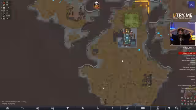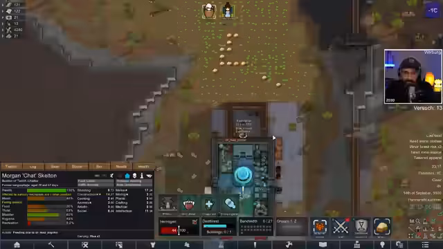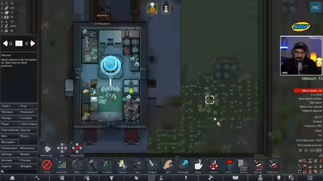 06:19:39Der Fokus liegt wieder auf dem RimWorld-Void-Szenario. Das Ziel ist, Lebensmittel zu sammeln, die beiden Gefangenen aus dem Gefängnis zu holen und parallel die Solartechnologie zu erforschen. Die Kolonie kämpft jedoch mit existenziellen Problemen, insbesondere mit einem extremen Nahrungsmangel. Die Nahrungsmittel reichen kaum, um die beiden Charaktere zu ernähren, und der Ernteertrag ist gering. Dies zwingt den Streamer dazu, seine Zeit mit Überlebensaktivitäten statt mit dem Aufbau der Kolonie oder der Erforschung zu verbringen, was den Fortschritt massiv verlangsamt.