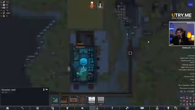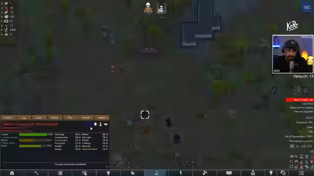 01:33:54Der Streamer beschäftigt sich mit dem Fortschritt in RimWorld V.O.I.D. und der Notwendigkeit, Ressourcen wie Stroh, Nägel und eine Kelle zu beschaffen, um das Camp zu upgraden und eine T2-Quest anzunehmen. Er äußert Bedenken bezüglich der Schwierigkeit der Quest, da seine aktuelle Ausrüstung und seine Gesundheit nicht ausreichen, um die damit verbundenen Gefahren wie Arachniden effektiv zu bekämpfen. Das Ziel ist, das Level zu steigern und bessere Ausrüstung zu erhalten.
