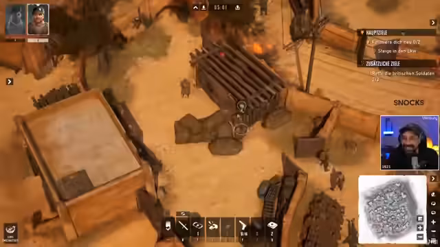 03:04:05Zu Beginn des Streamings wird das Gameplay des neuen Commandos-Spiels vorgestellt. Der Streamer arbeitet sich missionarisch durch das Level, indem er Gegner mithilfe von Fallen, Pfeifen und listigen Manövern ausschaltet. Der Fokus liegt dabei auf taktischem Vorgehen und dem Lösen von Rätseln, anstatt auf offenen Kämpfen. Er beschreibt das Genre als ein entspanntes, aber bei Hardcore-Spielweise auch forderndes Puzzle-Game.
