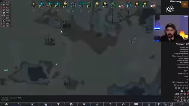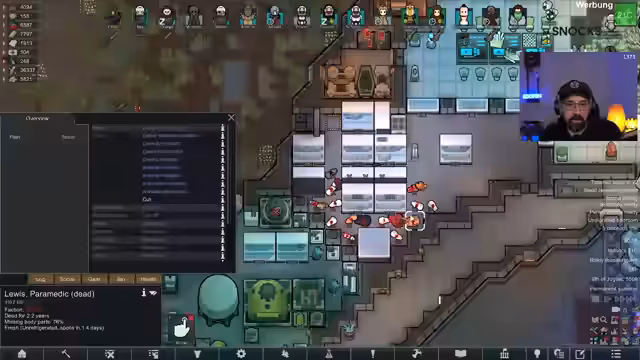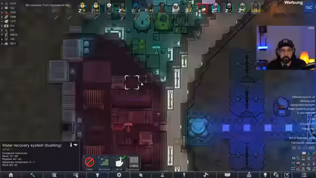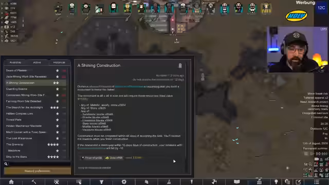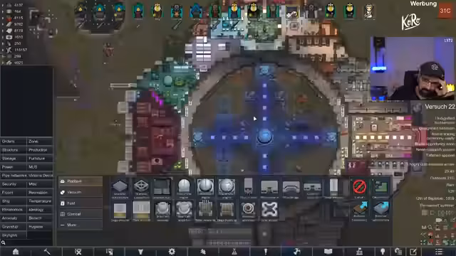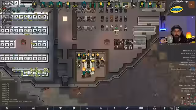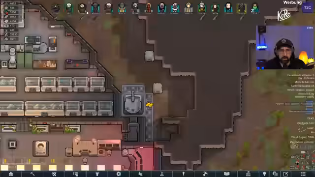 00:15:57Nach dem Einstieg in das Spiel stellt der Streamer den aktuellen Zustand der Kolonie vor. Der 'Voidrun' dauert bereits knapp 45 Spielstunden, der Koloniewert beträgt 11 Millionen. Ein großes Raumschiff wurde errichtet, das verschiedene Bereiche wie Maschinenraum, Kern, Wohnquartiere und Waffenkammer umfasst. Die Kolonie besitzt ein Atomkraftwerk, Solaranlagen und eine Algenproduktion für Sauerstoff. Letzte Woche wurde die Figur 'Orange' getötet und ihr legendäres 'Price of Pride'-Trinket verloren. Eine aktuelle Quest verlangt den Bau eines Monuments, wofür Steine benötigt werden und eine Gefährdung durch Void-Raids besteht.