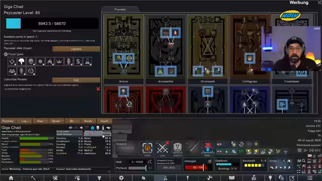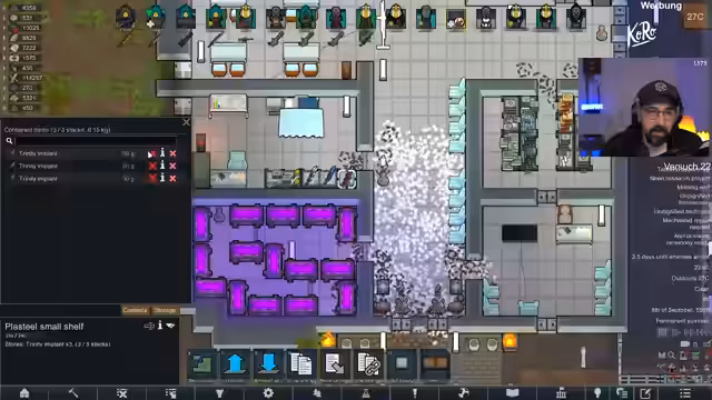 01:34:58Es wird eine intensive Phase der Verbesserung der Charaktere eingeleitet. Streamer und Chat identifizieren fehlende oder beschädigte Implantate und beginnen mit einer Serie von Operationen. Dabei werden Körperteile wie Beine, Arme und Herzen ersetzt und hochwertige Implantate wie das 'Memory Projector' oder 'Plastal Skin' installiert, um die Fähigkeiten und die Überlebensfähigkeit der Truppe zu maximieren. Auch die Verbesserung von Waffen und Rüstungen auf 'Masterwork'-Qualität wird priorisiert.