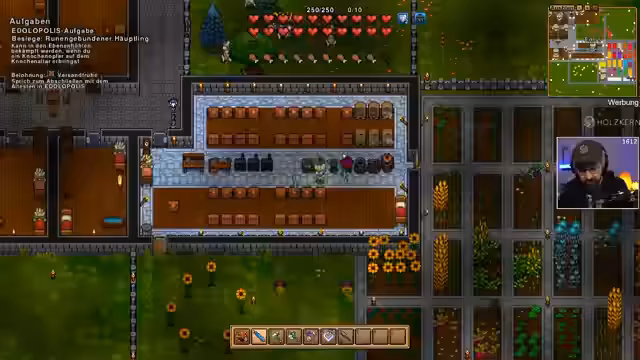 02:04:16Nachdem der Streamer ausreichend Quarz gesammelt hat, beginnt er mit der Herstellung von Rüstungssets für seine Charaktere. Er stellt fest, dass er noch ein Rüstungsset benötigt, um alle seine Leute mit der verbesserten Quarzrüstung auszustatten. Die Charaktere sollen sich selbstständig mit den neuen Rüstungen ausstatten. Parallel dazu kümmert er sich um die Kochrezepte in seiner Siedlung. Er stellt fest, dass er nur wenige Kartoffeln und Chilis hat, aber viele Fische und Popcorn. Er entscheidet sich, Popcorn und Brot in größeren Mengen herstellen zu lassen, um den Hunger seiner Leute zu stillen. Die automatische Sortierung der Gegenstände in spezielle Kisten für Bossgegenstände, Tränke, Saatgut und Nahrung wird gelobt. Auch die Herstellung von Mehl, gemahlenem Reis, Zucker und gemahlenem Kaffee wird in Auftrag gegeben, um die Versorgungskette zu optimieren. Er bemerkt einen Mangel an Hühnern und Sonnenblumen, die er noch besorgen muss, um Heiltränke herstellen zu können.