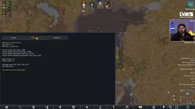 06:53:14Nach einer kurzen Kaffeepause wird das Strip-Mining fortgesetzt, um weitere Ressourcen zu gewinnen, wobei die Fluchtoption bei Insektenbefall beibehalten wird. Die Shieldbelts und die Wasserversorgung sind gesichert. Die Forschung konzentriert sich nun auf Waffen, während die Jamming-Protokolle verstärkt werden, um die Verteidigung gegen Angriffe zu verbessern. Die Entdeckung von zusätzlichem Stahl wird begrüßt, obwohl eine Überladung des Raumschiffs vermieden werden soll. Die Chimera-Angriffe werden abgewehrt, wobei der Jammer eine wichtige Rolle spielt. Die Notwendigkeit, das Raumschiff zu vergrößern, wird betont, und die letzte Ernte wird eingebracht, bevor die Kolonie weiterfliegt. Die Wasserversorgung wird durch das Zapfen von Wasser in hölzernen Wassertrögen sichergestellt. Die Kolonie bereitet sich auf den Flug in ein verseuchtes Gebiet vor, wobei die Maintenance des Roboters niedrig ist. Die Landung in der verseuchten Wüste erweist sich als extrem unangenehm, da das gesamte Gebiet zu 100% verseucht ist, was sogar das Raumschiff betrifft. Die Auswirkungen der Verseuchung auf die Kolonisten sind noch unklar, und es besteht die Gefahr eines Toxic Bildhubs. Die Situation wird als Katastrophe eingestuft, und die Möglichkeit eines Run-Endes wird in Betracht gezogen.