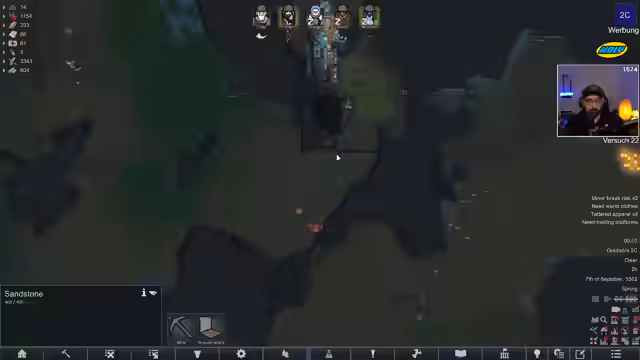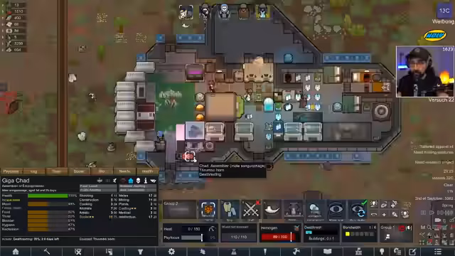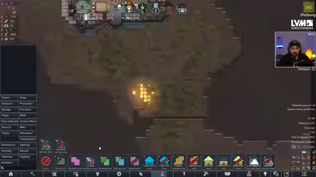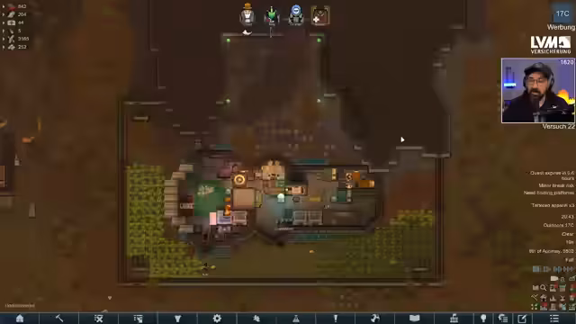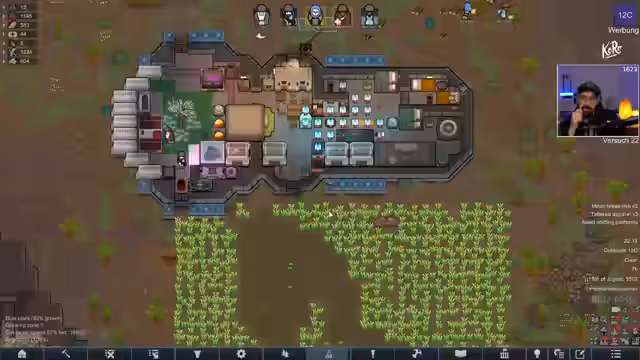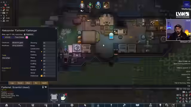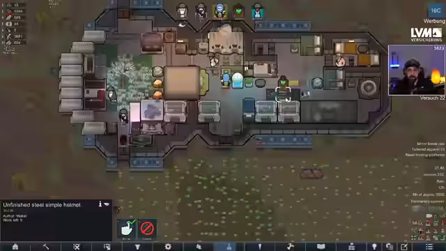 05:33:13Orange entwickelt sich zum Technomancer, um Reparaturen durchzuführen, die Qualität von Gegenständen zu verbessern und Reverse Engineering zu betreiben. Das langfristige Ziel ist es, Void-Rüstungen zu erbeuten, zu analysieren und selbst herzustellen. Der Streamer plant, Implantate von Voids erst dann zu entnehmen, wenn die Kolonie über bessere Rüstungen und Waffen verfügt, um den Koloniewert nicht zu schnell in die Höhe zu treiben und damit stärkere Raids zu provozieren. Dies erfordert Forschung und Konstruktion, wofür das Raumschiff erweitert werden muss. Eine große Forschungsbank wurde bereits gebaut. Das nächste Ziel ist der 'Ancient Stockpile', um Gravkorps und Platten zu sammeln. Der Streamer spielt auf dem höchsten Schwierigkeitsgrad 'Losing is Fun' mit einer zusätzlichen Void-Mod, die das Spiel extrem herausfordernd macht. Er ist bereits im 22. Versuch, was die Schwierigkeit des Hard Permadeath-Runs unterstreicht.