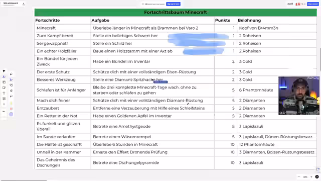 00:18:07Die Analyse der spezifischen Achievements beginnt, wobei ein gemeinsames Whiteboard zur besseren Organisation genutzt wird. Die Achievements sind in verschiedene Kategorien wie Minecraft, Nether, End, Technik etc. unterteilt. Es wird ein System zur Kennzeichnung der Aufgaben eingeführt: Grün für 'Easy Diamonds', Rot für 'Wichtige Items' und Blau für 'Wichtig Early', um eine Priorisierung für den Start zu ermöglichen. Dies soll helfen, eine effiziente Strategie für die Punktegewinnung zu entwickeln.