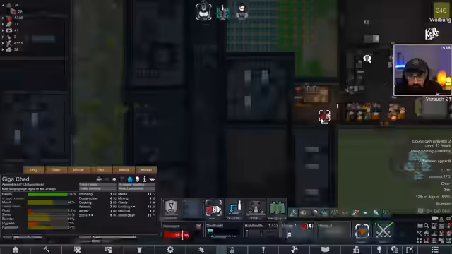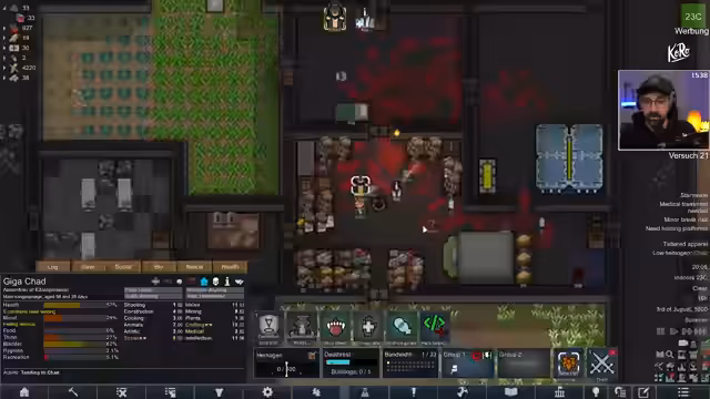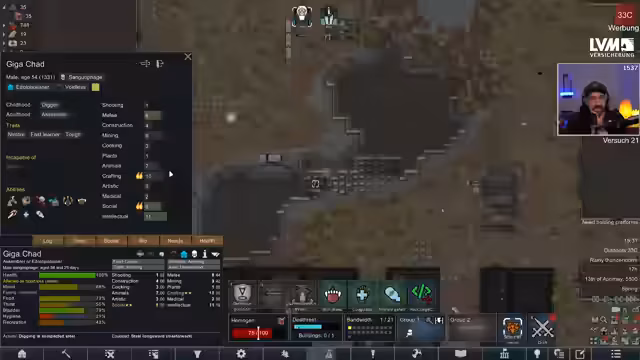 05:53:11Die Kolonie in RimWorld steht vor mehreren Herausforderungen, darunter die Suche nach dem abgestürzten Raumschiff, das für die Forschung von GravTech unerlässlich ist, aber noch nicht aufgetaucht ist. Die Stimmung der Kolonisten ist schlecht, was durch verschiedene Ereignisse wie Gewitter und den Tod eines potenziellen Kolonisten namens Kekklack, der versehentlich von einem anderen Kolonisten getötet wurde, weiter verschlechtert wird. Die Spieler suchen aktiv nach neuen Kolonisten, um die Mannschaft zu verstärken und die Moral zu verbessern. Bei der Erkundung alter Ruinen wird ein „Masterwork McLord Helmet“ entdeckt, der die Mech-Bandbreite erheblich erhöht und somit den Bau von mehr Robotern ermöglicht, obwohl die Stromversorgung eine Herausforderung darstellt. Zudem wird Luciferium gefunden und ein weiterer potenzieller Kolonist, Kevin, mit schlechten Eigenschaften, der jedoch letztendlich von einem Stalker gefressen wird. Ein weiterer Stalker-Angriff führt zu kritischen Verletzungen bei den Kolonisten Kay und Kevin, die beide Beine verlieren, aber überleben. Die Spieler müssen sich nun um die Heilung und den Ersatz der Gliedmaßen kümmern, während sie weiterhin nach dem Raumschiff suchen und ihre Basis gegen Infestationen verteidigen.