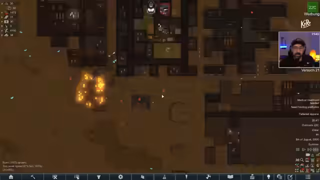 06:39:53Es wird überlegt, sich einzubauen und einige Tage zu forschen, da die Kolonie unter schlechter Laune leidet und es an grundlegenden Einrichtungen wie Lampen mangelt. Ein unerwartetes Problem tritt auf: 'Kay' ist von 'Toxic Buildup' betroffen, was auf eine unbekannte Ursache zurückgeführt wird, möglicherweise auf eine Interaktion mit einem Monster. Die Forschung für das Raumschiff, insbesondere 'Microelectronics' und 'Basic Electronics', erweist sich als komplizierter als erwartet, da die notwendigen Technologien versteckt oder durch Mods verändert wurden. Der Koloniewert steigt drastisch von 20.000 auf 140.000 durch das 'Claimen' von Gebäuden, was als lebensgefährlich für die Kolonie eingestuft wird, da dies stärkere Raids anzieht. Diese unerwartete Erhöhung des Wealth macht die Situation noch gefährlicher und unterstreicht die Komplexität der Spielmechaniken.