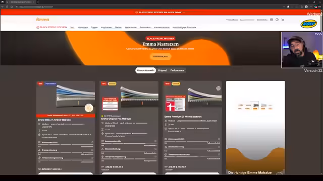 08:16:00Der Streamer verkündet, dass der aktuelle Durchlauf der letzte Vorversuch war, um alle notwendigen Informationen für den finalen Anlauf zu sammeln. Er ist überzeugt, nun einen klaren Plan zu haben und kündigt an, dass dies der letzte Versuch sein wird. Scheitert dieser, wird ein anderer Rimworld-Run gestartet. Parallel dazu wird eine Kanalpunktewette gestartet, bei der die Zuschauer wetten können, ob alle Kolonisten und Chor bis 0:30 Uhr überleben. Zudem erfolgt ein letzter Shoutout an Emma, da die dreimonatige Kooperation diesen Monat endet. Er weist auf die Black Friday Sales von Emma hin und erwähnt, dass mit seinem Code zusätzlich 5% gespart werden können. Aktuell gibt es beim Kauf einer Airgrid-Matratze ein kostenloses Classic Stützkissen, welches er persönlich sehr empfiehlt. Er betont, dass er selbst das Kissen nutzt und es als sehr komfortabel empfindet. Matratzen können bis zu 100 Nächte probegeschlafen werden, und bei Nichtgefallen werden sie aufbereitet und als Secondhand weiterverkauft, was er als nachhaltig hervorhebt. Kopfkissen haben eine 30-tägige Probeschlafphase und zwei Jahre Garantie, während Matratzen bis zu zehn Jahre Garantie bieten. Er geht auch auf frühere Support-Probleme von Emma ein, die durch schnelles Wachstum entstanden sind, versichert aber, dass diese behoben wurden. Die Black Friday Angebote laufen noch bis zum 1. Dezember, und er ermutigt die Zuschauer, den Link zu nutzen, um den Stream zu unterstützen, jedoch nur Produkte zu kaufen, die sie wirklich benötigen.