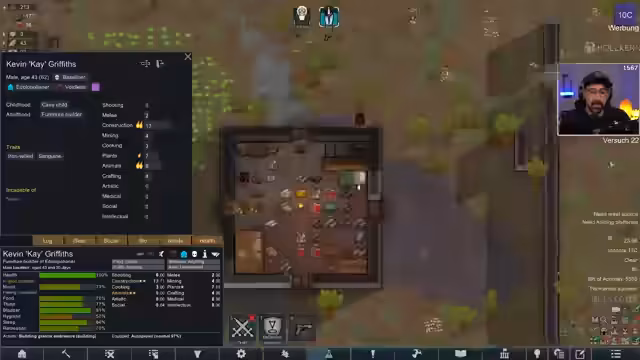 06:33:31Der Streamer steht vor der Herausforderung, einen passenden Kolonisten zu finden, da 'Jet' keine nützlichen Fähigkeiten besitzt und daher entlassen wird. Es wird über die veränderte Helligkeit in Gebäuden diskutiert, die nicht mit Gamma-Einstellungen oder dem neuen Computer zusammenhängt, sondern vermutlich durch eine Mod, einen Patch oder ein DLC verursacht wird. Die Suche nach brauchbaren Kolonisten gestaltet sich schwierig, da viele der gefundenen Charaktere, wie 'Undergrounder', keine nützlichen Fertigkeiten für die Kolonie mitbringen. Die Stimmung in der Kolonie sinkt, was durch das Ablehnen von Kolonisten und die allgemeine Situation noch verstärkt wird. Es zeigt sich, dass selbst scheinbar einfache Entscheidungen, wie das Freilassen von Kolonisten, Auswirkungen auf die Moral und den Fortschritt haben.