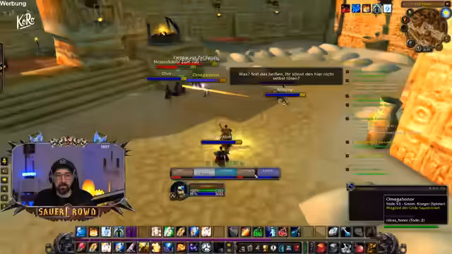 03:05:14Es kommt zu mehreren Toden in der Gilde, was zu Frustration und Diskussionen führt. Lost Kitten stirbt, nachdem die Gruppe nicht schnell genug eine Instanz verlassen hat, und Gucci Warrior verliert ebenfalls das Leben. Diese Ereignisse werden als Rückschläge für die Gilde angesehen. Der Streamer spricht über ein ähnliches, beinales Todeserlebnis mit seinem Heiler Cuddy, der während eines Wirbel-Attacke des Bosses nicht heilen konnte, was ihm das Leben hätte kosten können.