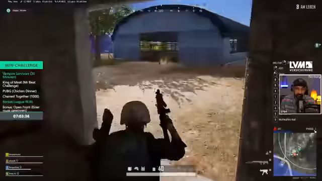 07:45:39Zu Beginn des Streams koordinieren sich die Teilnehmer einen koordinierten Angriff auf mehrere gegnerische Teams in der Win Challenge. Es wird eine klare Strategie verfolgt, um zuerst ein Auto mit mindestens zwei Gegnern auszuschalten. Nach dem Erfolg dieses Manövers wird die Jagd auf einen weiteren, alleine spielenden Gegner fortgesetzt. Dabei stellt das Team fest, dass sie versehentlich in eine Lobby mit vielen Bots gelangt sind, was den Schwierigkeitsgrad der Challenge signifikant reduziert und für ein ungewollt einfaches Spiel sorgt.