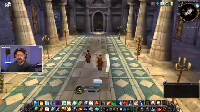 02:46:22Nachdem die Gruppe die Instanz betreten hat und die 'Wachen' freundlich sind, da sie als 'König' agiert, können die Buffs aktiviert werden. Der Streamer erklärt den Prozess: Man muss die Wachen rechts anklicken, um die Buffs zu erhalten. Er betont ausdrücklich die Wichtigkeit, alle Buffs nach der Aktivierung wieder einzupacken, um sie während des Raids sicher zu halten und versehentlich zu verlieren.