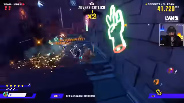 02:19:40Nach anfänglichen Schwierigkeiten entwickelt sich das Team und meistert eine anspruchsvolle Jump-and-Run-Sektion. Das Gameplay erfordert präzise Sprünge, das Nutzen von Kräften wie Luftlaufen und das Sammeln von Kronen und Truhen. Der Streamer übernimmt oft eine führende Rolle und navigiert durch die Level, während andere Teammitglieder wie Asta Müsse haben, aber schließlich zum Sieg beitragen.
