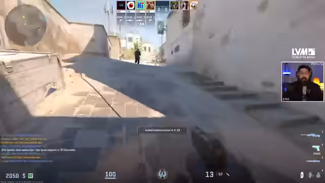 05:49:47Das Match beginnt und der Streamer agiert als Ingame-Leader. Die Taktiken für die erste Runde werden kurzfristig ausgeklügelt. Als Terroristen entscheiden sie sich für einen Rush B, was jedoch scheitert, da die gegnerische Spielerin bereits auf der B-Seite positioniert war. Es folgt eine strategische Runde, in der sie als Öko-Runde versuchen, wirtschaftlichen Schaden anzurichten, was letztendlich erfolgreich ist und ihnen einen Full Buy in der nächsten Runde ermöglicht.