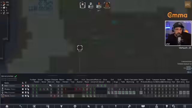 05:46:44Das Team kämpft mit sinkenden Ressourcen und beschränkten Lagerräumen. Der Streamer überlegt, den Spielgenerator in geschlossenen Räumen zu betreiben, ohne ausreichende Belüftung. Gleichzeitig wird die Forschung an Microelectronics fortgesetzt, um wichtige Technologien wie EMP-Granaten zu entwickeln. Das Gameplay ist anspruchsvoll und erfordert maximale Konzentration, um Fehler zu vermeiden, die hart bestraft werden.