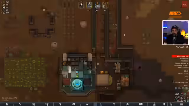 05:59:59Der Streamer befindet sich in einer kritischen Situation in RimWorld. Er hat ein Raumschiff ohne ausreichend Platz und ist in einer extremen Wüste mit hohen Temperaturen (bis zu 54 Grad) gestrandet. Nahrung und Ressourcen sind knapp, und er plant, einen Bunker zu hacken, um wichtige Bauteile für die Raumschiffserweiterung zu finden. Streamer bespricht verschiedene Strategien, dar das Angeln und die Jagd auf Tiere.
