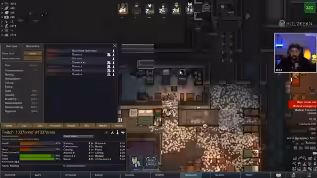 00:47:33Der Streamer freut sich über den Tod eines Raubtiers und stellt fest, dass Chad noch am Leben ist und über gute Werte verfügt. Er stellt jedoch fest, dass er keine Medizin mehr hat und versucht, an weitere Medizin zu gelangen. Adam wird wach und legt sich ins Schätzbett. Der Streamer stellt fest, dass es draußen kalt ist und er die Mechanoiden töten muss, bevor der nächste Raid kommt. Er nutzt die vielen Türen in der Basis als Verteidigung. Wallace und Chad überleben einen Angriff, aber Adam wird katatonisch. Der Streamer tötet einen Mechanoiden und versucht, die Basis wiederaufzubauen. Er stellt fest, dass er viele Leichen beerdigen muss. Der Streamer versteht das Design der Basis nicht und sucht nach dem Eingang. Er stellt fest, dass der Koloniewert hoch ist, aber er nur wenige Leute und keine Rüstung hat. Der Streamer überlegt, ob er das Raumschiff bauen soll, um mit Chad von dem Planeten zu fliehen. Er braucht jedoch mehr Leute und Waffen. Der Streamer fragt im Chat, ob Matteo noch weiterspielen möchte und ob er den Run zu Ende bringen soll.