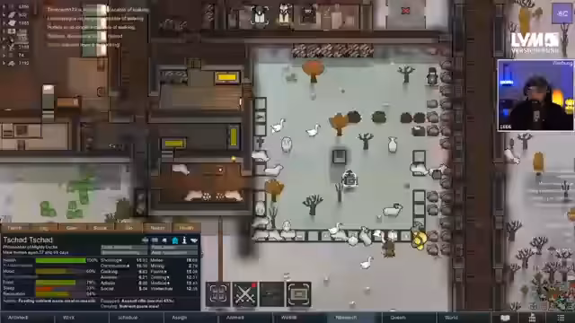 00:58:46Ein Mechanoid mit Metal-Blood greift an und der Streamer versucht, ihn zu töten. Er stellt fest, dass Chad craften kann und gibt ihm eine bessere Waffe. Der Streamer kümmert sich nicht um die sterbenden Tiere und versucht, die Basis zu schließen. Er stellt fest, dass die Base sehr groß ist und er zu wenige Kolonisten hat. Der Streamer versucht, an neue Leute zu kommen und sucht nach seinem Spaßstab. Der nächste Raid wird entscheidend sein. Der Streamer lässt Chad die Basis bauen und stellt fest, dass Chad ein guter Charakter ist. Er fragt sich, womit Matteo seinen Strom produziert und entdeckt das Geo da unten. Der Streamer erinnert sich daran, dass er den Anfang des Runs gerettet hat. Er bringt Chad in den sicheren, warmen Raum und bekämpft die Max. Der Streamer stellt fest, dass Chad die Wundinfektion wahrscheinlich überlebt hätte, da er gute Medizin und ein gutes Bett hat. Ein Transportbot crasht und der Streamer hofft, dass sich die Person ihm anschließt. Er möchte niemanden überzeugen, da dies zu viel Zeit kostet. Der Streamer muss die Basis aufbauen und hat nur eine Person, die arbeiten kann. Er versteht die Overcooler-Gedöns nicht. Chat hat schlechte Laune und der Streamer gibt ihm Kokain. Er überlegt, ob er alle Tiere schlachten soll, da sie ihn nerven. Der Streamer lässt die Tiere frei, da er sich nicht um sie kümmern kann. Adam wird wach und der Streamer lässt ihn arbeiten. Der Streamer versteht das Design der Basis nicht und fragt sich, warum hier Fallen sind.
