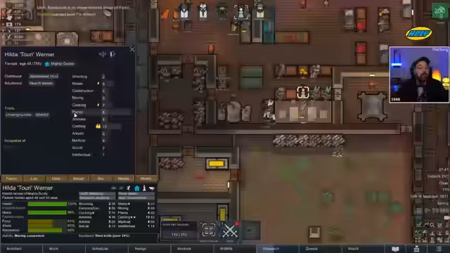 05:20:09Es gibt endlich Raids, und der Fokus liegt darauf, gute Miner zu finden. Maja Portier, Oma Long, King, Kevin und Warmwasserwerfer werden als potenzielle Rekruten identifiziert. Warmwasserwerfer und Portier sollen mit Suki gefangen werden. King stirbt währenddessen. Warmwasserwerfer wird erfolgreich rekrutiert. Es werden weitere Charaktere rekrutiert, darunter Kevin. Durch die Rekrutierungen gibt es jetzt zwei Pyromanen, was als positiv angesehen wird. Warmwasserwerfer erleidet einen psychischen Schock im Gehirn. Es werden Waffen eingesammelt und eingeschmolzen. Das Ziel ist es, 13 Kolonisten zu erreichen, um schneller arbeiten zu können. Es werden Ressourcen für den Raketenbau benötigt, insbesondere Blaststahl und Uran. Der Streamer hat keinen Plastahl und muss diesen beschaffen. Jodinski wird als Kämpfer rekrutiert, Warmwasserwerfer als Doppelflammen-Miner, Lois als Undergrounder-Miner und Memory Lag als Schütze und Koch. Es wird überlegt, Memory Lag ein bionisches Auge zu geben. Der aktuelle Rimbitrun in Episode 6 läuft gut mit viel Action. Es wird überlegt, den Single Run in ProSommer wieder zum Laufen zu bringen, aber es gibt Probleme mit dem neuen Patch. Der Streamer möchte auch den B42-Multiplayer weitermachen und hat dort ein klares Ziel.