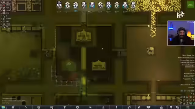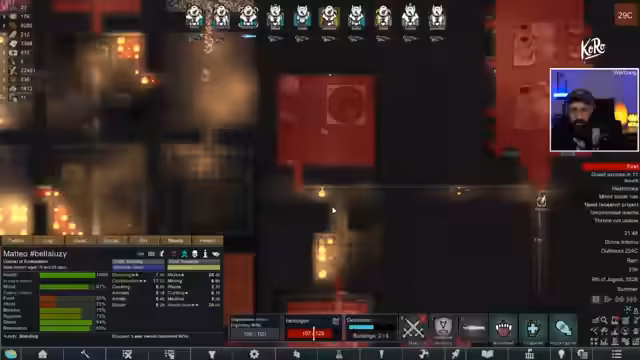 03:36:37Die Präsentation von Holzkern endet abrupt durch eine technische Panne, bei der ein lautes Audio-Ereignis den Streamer erschreckt. Nach einer Entschuldigung an das Publikum kehrt das Gameplay zu RimWorld zurück. Die Basis ist teilweise wieder aufgebaut, doch der Mangel an Blut für die Produktion von Chemie droht ein ernstes Problem zu werden. Um künftige Imperium-Angriffe effektiver zu gestalten, wird eine neue, taktischere Strategie geplant. Diese beinhaltet den Einsatz von Transport-Hubschraubern, um mobile Verteidigungsanlagen, bestehend aus großen Batterien und Schilden, an den Feind heranzutragen und so die Kämpfe zu kontrollieren.