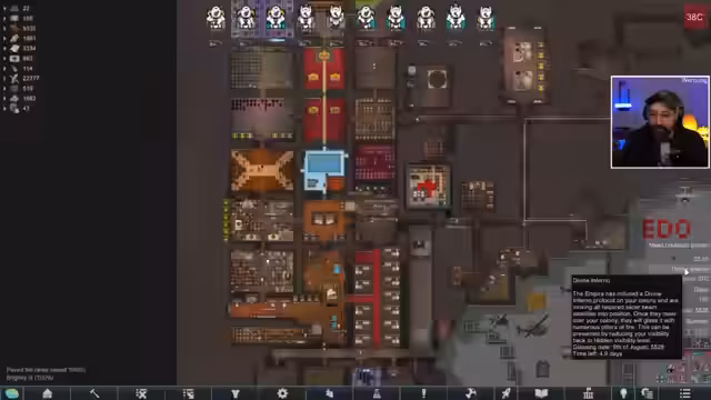 01:37:22Der Streamer betont mehrfach, dass er keine Ahnung hat, was genau bei der 'Divine Entfernung' passieren wird. Dies ist der erste Lauf mit den entsprechenden Mods, und er hat sich nicht spoilern lassen. Die einzige Information ist, dass das Imperium Satelliten zur Zerstörung der Kolonie in Stellung bringen wird. Dies erzeugt viel Unsicherheit und Angst. Die Visibility kann nicht rechtzeitig gesenkt werden, um den Angriff abzuwenden.