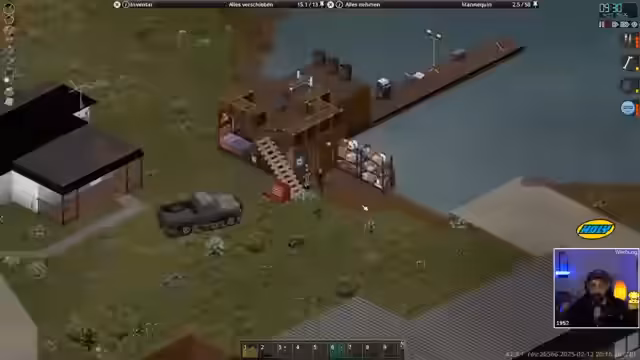 00:59:15Mit dem frisch geladenen Anhänger voller Bauteile und Möbel beginnt der Streamer mit dem systematischen Aufbau der Basis am See. Er zeigt, wie man in Project Zomboid Fahrzeuge panzern kann, indem man diverse Teile wie Fenster- und Stoßfängerschutz anbringt. Nach einer gescheiterten Loot-Tour im angespannten Zustand des Charakters wird die Entscheidung getroffen, die Mission für den Tag zu beenden und am nächsten Tag fortzusetzen. Der Fokus bleibt auf dem Ausbau der Basis und der Stärkung des Charakters.