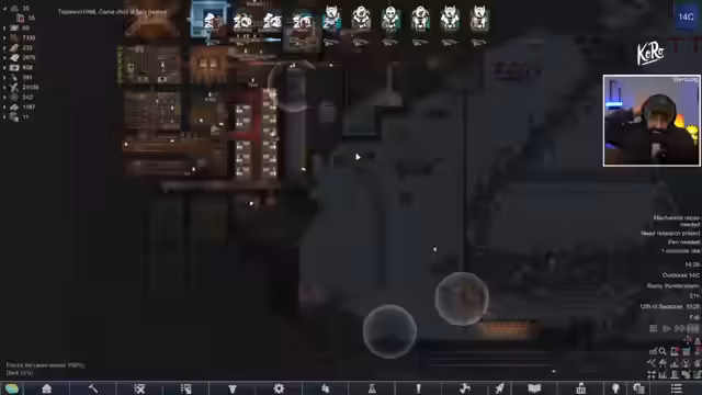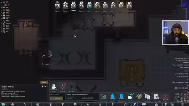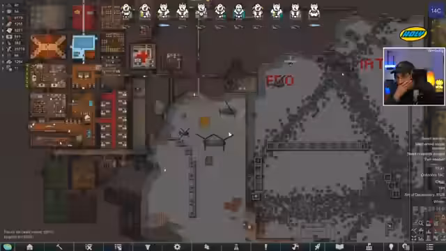 00:13:43Der Streamer startet RimWorld und bereitet sich auf die Mission vor, ein Senatsmitglied zu eliminieren. Es handelt sich um die erste 5-Sterne-Mission und er ist besorgt, da die vorherige 4-Sterne-Mission verloren wurde. Die Kolonie hat nur noch 10 Mitglieder und ist资源arm, was die Mission erschwert. Er beschreibt die Zerstörungen durch ein 'Divine Inferno' und die aktuellen Reparaturarbeiten.