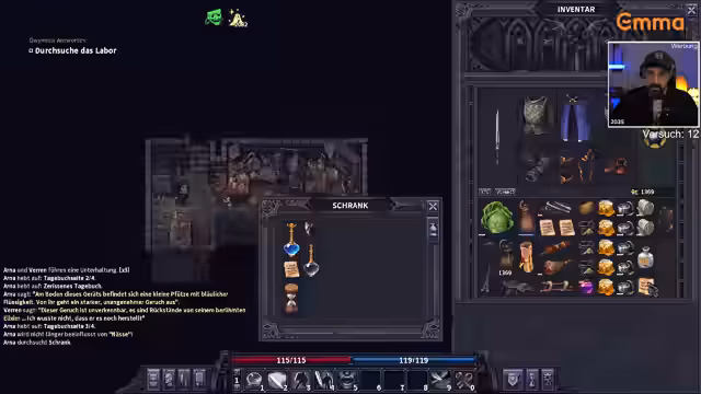 01:47:06Es wird überlegt, einen Rucksack zu kaufen, aber auf Defense-Werte verzichtet. Eine Verzauberungsscroll wird genutzt, um die Boots zu verbessern, jedoch ohne Erfolg. Ein blaues Amulett wird identifiziert und als Stich- und Unhaltigresistenz erhöht. Es wird gehandelt, wobei die Preise als schlecht empfunden werden. Eine Ghulhütte wird entdeckt, und es wird überlegt, gegen Ghule zu kämpfen. Neue Aufträge werden angenommen, darunter ein mysteriöses Verschwinden. Es wird entschieden, den Rucksack mitzunehmen, um mehr Zeug transportieren und Kohle verdienen zu können. Der Umhang wird zurückgelassen, um den Vorteil des Rucksacks nicht zu verlieren. Es wird bestätigt, dass der Rucksack nicht im Winter geöffnet werden kann und am Rücken getragen werden muss. Der Charakter begibt sich auf den Weg, wobei die Moral aufgrund von Qualität und Vielfalt verzerrter Lebensmittel niedrig ist. Es wird überlegt, im Gasthaus zu essen und zu schlafen, um die Moral zu verbessern. Verschiedenes Essen gibt verschiedene Boni, ähnlich wie in Valheim. Der Nassbuff wird thematisiert, der negative Auswirkungen hat. Es wird entschieden, nicht im Gasthaus zu schlafen, sondern direkt zu kämpfen.