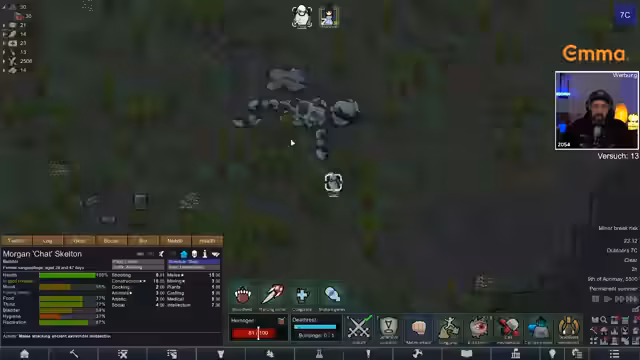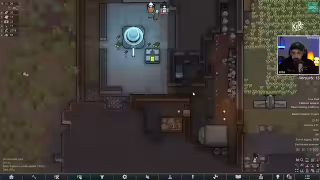 04:20:38Es wird angekündigt, dass zu RimWorld gewechselt wird, um zu sehen, ob überlebt wird, obwohl es aktuell viele Max gibt. Das Ziel ist, ein Monster in RimWorld zu zähmen. Der Streamer bevorzugt Erdbändiger gegenüber anderen Elementen. Es wird bestätigt, dass es morgen StoneShot geben wird. In RimWorld ist es Versuch 12. Es wird eine Vorhersage für den Stream gewählt, ob alle Kolonisten bis 0:30 überleben. Der Streamer plant, die Zuschauer an einem Schiffbau-Wettbewerb in Yuichi und Tideon teilnehmen zu lassen. Es wird betont, dass der aktuelle StoneShot-Run wirklich gefühlt wird und die Runensteine die Möglichkeit bieten, aus Kämpfen abzuhauen. Es wird erwähnt, dass ein neuer, sehr guter Run in StoneShot gestartet wurde. Es wird angekündigt, dass es zu viele Games gibt, auf die der Streamer sich freut und die Spiele durchgespielt werden müssen. Der aktuelle StoneShot-Build wird als fehlerfrei und sicher beschrieben. In RimWorld sind es 37 Grad, es gibt sechs Kolonisten und Lebensmittel sind knapp. Die Kolonie wurde von Zombies angegriffen, konnte aber gehalten werden. Es wird versucht, am Anima-Baum zu meditieren. Es werden Leute gesucht, die meditieren und craften können. Es wird festgestellt, dass niemand im Team Crafting Skill besitzt, was ein großes Problem darstellt. Es wird das Ziel gesetzt, jemanden mit Crafting-Skill zu rekrutieren. Es wird diskutiert, dass Handwerker im Spiel selten sind und ein Mindestlevel benötigen. Es wird festgestellt, dass die Void noch nicht in der Nähe sind. Es wird festgestellt, dass Crafting ein Mindestlevel benötigt. Es wird überlegt, ob ein Agrarmech geholt werden soll. Es wird festgestellt, dass der aktuelle Run aufgrund von Mechs schwierig ist und ein Fluchtversuch unternommen werden muss.