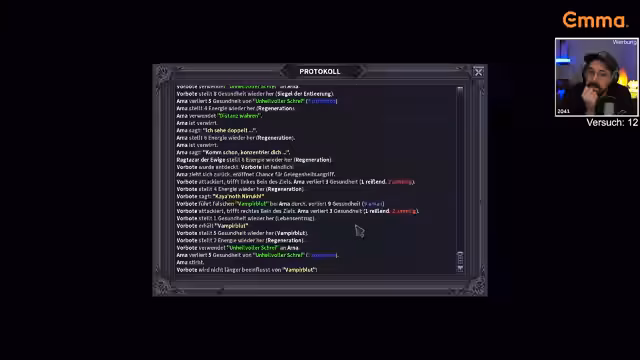 02:04:54Der Charakter stirbt unerwartet in einer Quest, da er verwirrt war und falsche Entscheidungen getroffen hat. Es wird analysiert, ob es ein Fehler war, den Rucksack und damit den Umhang auszuziehen, was möglicherweise Magieresistenz gekostet hat. Die Schwierigkeit des Kampfes wird auf zwei Debuffer zurückgeführt, die Verwirrung verursacht haben. Die Funktionsweise von Blutungsstille wird diskutiert, die eine Runde kostet und den Charakter anfällig für Nahkampfangriffe macht. Es wird gehofft, dass die Blutung beim Fliehen aufhört, um einen Free-Hit des Bosses zu vermeiden. Der Super Spell Second Wind hat nicht getriggert, was als Useless Perk bezeichnet wird. Es wird reflektiert, dass die beste Entscheidung gewesen wäre, zu decken. Der Blutungsplan wurde nicht ausreichend beachtet. Das Spiel wird als mathematisch nicht zu gewinnen eingeschätzt, aber es wird eingestanden, schlecht gespielt zu haben. Es wird das Ziel formuliert, beim nächsten Mal besser zu spielen. Das Spiel wird mit Battle Brothers verglichen, wo Können das Würfelglück überwiegt. Es wird erkannt, dass Flüchtigkeitsfehler gemacht wurden und dass der Einsatz von Krähenfüßen und Fallen hilfreich gewesen wäre. Der Chat ist voller Experten, die es im Nachhinein besser wissen. Es wird angekündigt, dass ein Waldhüter ausprobiert wird.