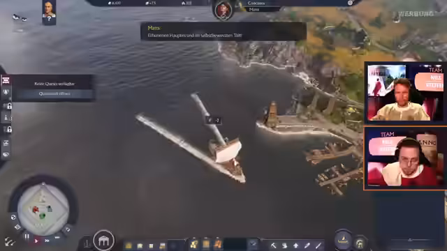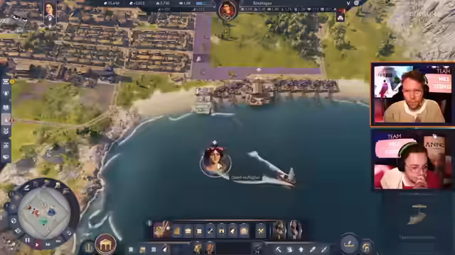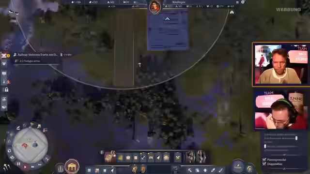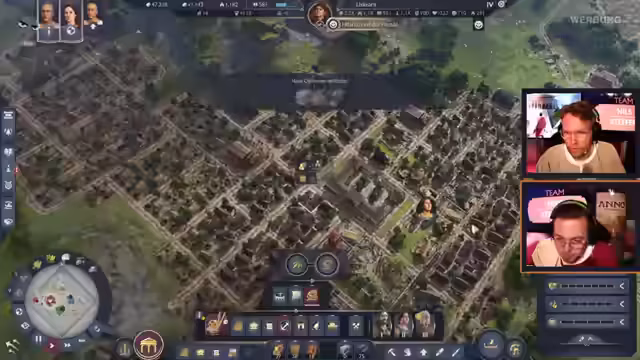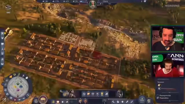 01:11:12Writing Bull fällt durch eine ungewöhnliche und langsame Baustrategie auf, bei der er Straßen einzeln und in einer nicht standardmäßigen Formation um Häuser herum baut, was auf einen Schönbau-Ansatz hindeutet. Bei Nils und Steffen wird früh ersichtlich, dass sie ihr Geheimziel, zwei Holzfällerlager pro Insel zu haben, nicht verfolgen, da sie deutlich mehr bauen. Dies wird als Verzicht auf drei Punkte interpretiert, um die anfängliche Holzversorgung zu sichern, obwohl die Kommentatoren glauben, dass das Ziel auch erreichbar gewesen wäre. Radler und Lena zeigen eine Siedlung in Erbien, die durch die Nutzung des 45-Grad-Straßen-Features auffällt. Ihr Geheimziel erfordert das Versenken von zehn feindlichen Schiffen, was als nicht einfach eingeschätzt wird. Die frühe Spielphase ist von finanziellen Herausforderungen geprägt, da die Spieler zunächst hohe Schulden machen und versuchen müssen, durch den Bau von Häusern und die Produktion von Luxusgütern wie Tuniken und Weckereien ins Plus zu kommen, um ihre Bürger aufzuwerten und mehr Steuern zu generieren.
