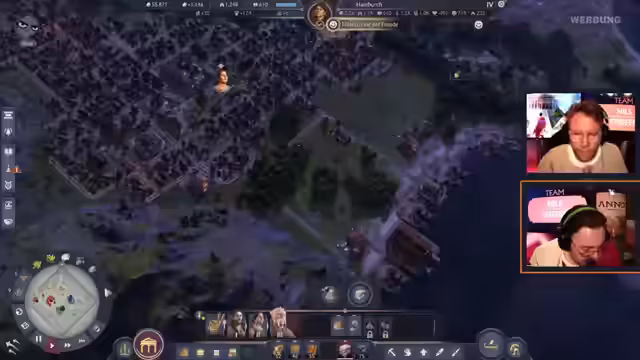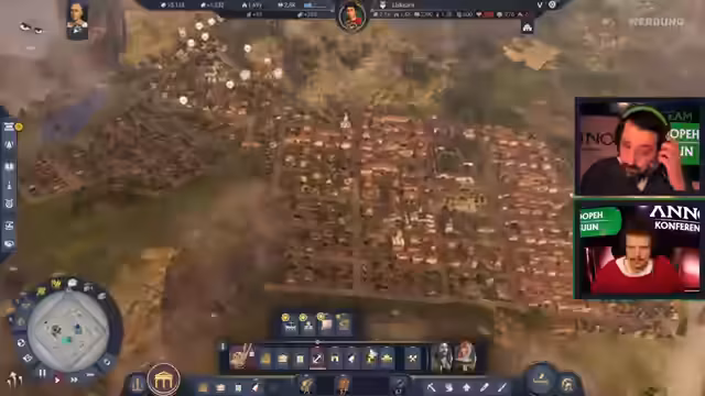 02:39:40Die Anno-Konferenz geht in die nächste Runde, wobei vier Zweierteams um die meisten Punkte kämpfen. Der Bau des Kolosseums markiert das Spielende und bringt sieben Punkte. Weitere Siegpunkte gibt es für das meiste Geld, die meisten besiedelten Inseln, die meisten Einwohner, das meiste Wissen, das höchste Ansehen und den höchsten Glauben (jeweils zwei Punkte pro Kategorie). Zusätzlich gibt es ein Chat-Voting für die schönste Siedlung (vier Punkte) und spezielle Geheimziele für jedes Team. Nils und Steffen hatten das Ziel, nur zwei Holzfällerlager pro Insel zu bauen, was sie zugunsten der Produktivität ignorierten. Gerardin und Writing Bull sollen Schweineställe neben ihrem Palast errichten, was sie bisher ablehnen. Radlerauge und Lena dürfen keine Feuerwehren bauen, was ihre Städte anfälliger für Brände macht, aber die Gefahr ihres Sieges ist hoch, da Radler bereits auf hohen Bevölkerungsstufen ist und ein hohes Einkommen erzielt. Es wird betont, dass alle Teams im Solo-Modus gegen den PC spielen, um technische Probleme zu vermeiden und einen reibungslosen Ablauf zu gewährleisten.